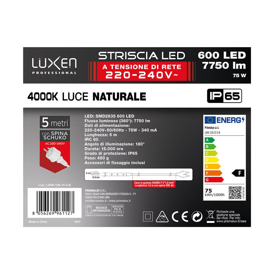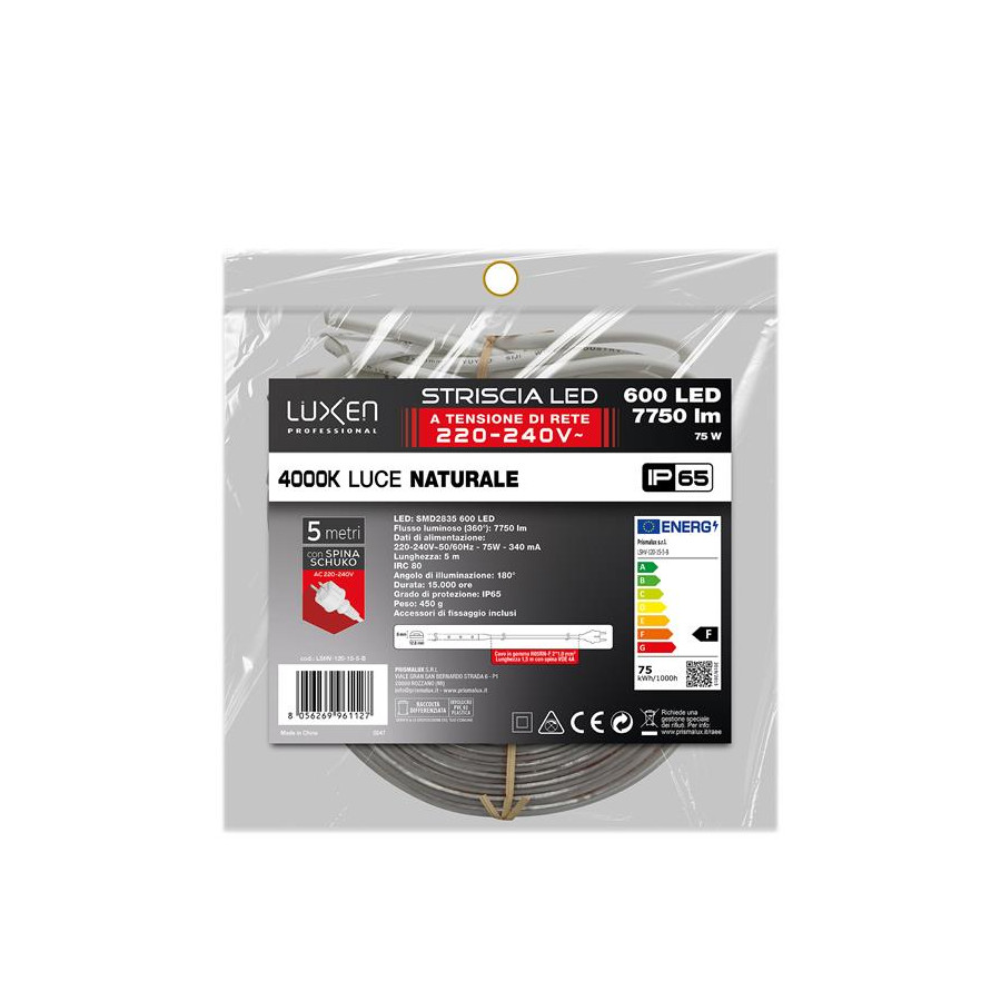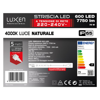 Striscia LED AC220V-240V 120LED/m con spina VDE 4A + 1.5m di cavo luce naturale