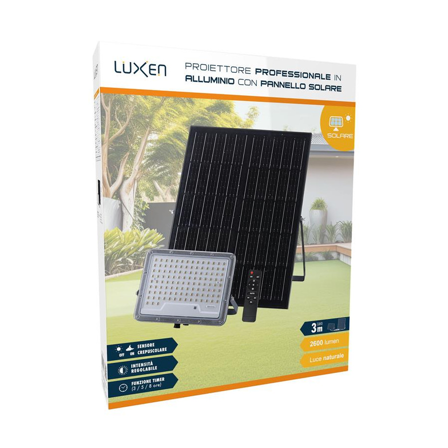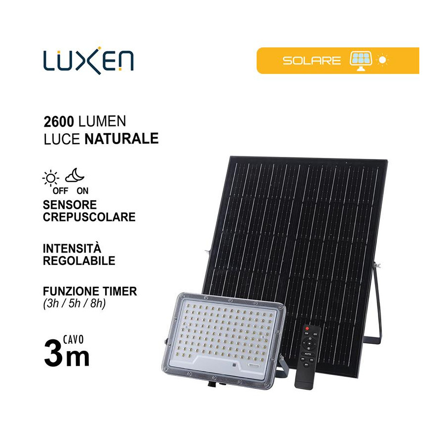 Proiettore solare 1900lm batteria LiFePO4 20Ah pannello Monocristallino 25W con 1m di cavo + 2m di prolunga