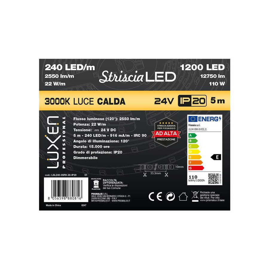 Striscia 5m luce calda 3000K - IP20 - 1250Lumens - 112 Chip - 2835