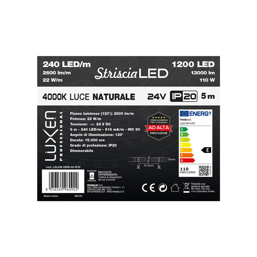 Striscia 5m luce bianca 4000K - IP20 - 1100 Lumens - 112 Chip - 2835