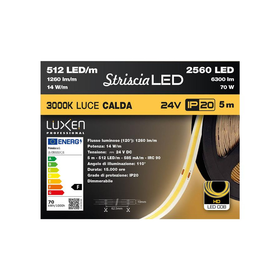 Striscia 5m luce Fredda 6500K- IP20 - 1400 Lumens - 512 Chip - HD COB
