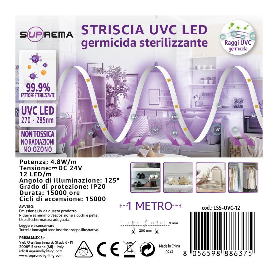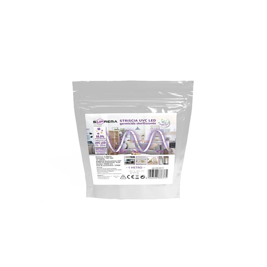 IMPORTANTE: non utilizzare la strip led UVC in presenza di persone o animali, la potente azione germicidia dei led UVC non consente la presenza di alcun essere vivente durante l'irradiazione della luce.