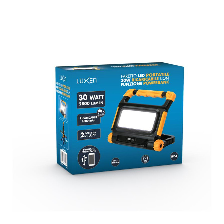 Proiettore Led da 30 W portatile ricaricabile con funzione powerbank con alimentatore incluso